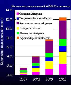 Что касается распределения пользователей по регионам, то, по крайней мере, до 2010 года лидером в данном отношении будет оставаться азиатско-тихоокеанский регион. Кроме того, достаточно активно беспроводные сети WiMAX будут развиваться в Западной Европе и Северной Америке. А вот в Африке и на Среднем Востоке дела с WiMAX, напротив, будут обстоять хуже всего.