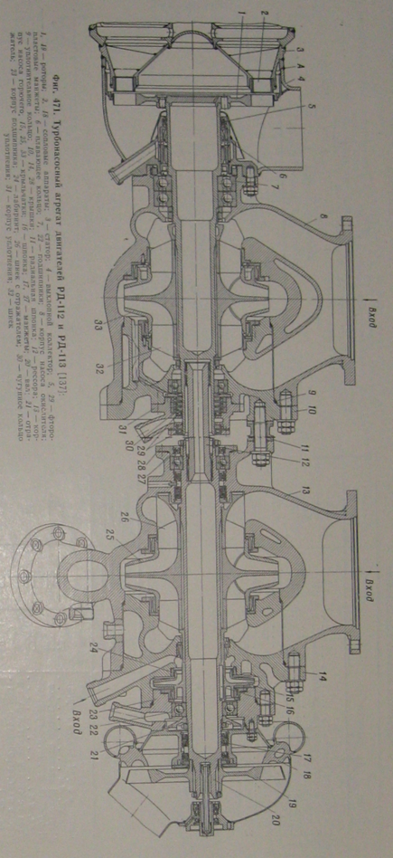 Разделение полостей основной турбины и насоса осуществляется с помощью гидрозатвора; в полость гидрозатвора (между двумя плавающими лабиринтными кольцами 6) подается окислитель с давлением, превышающим давление в полости выхлопного коллектора турбины. Фторопластовая манжета 5 обеспечивает герметичность полости залитого насоса окислителя до пуска двигателя. Система уплотнений по валу со стороны насоса горючего состоит из набора разрезных чугунных колец 30 и дренажной полости. Фторопластовые манжеты 29, как и манжеты 5, уплотняют полость насоса до пуска двигателя. Утечки жидкости из полости высокого давления в полость всасывания насоса сведены к минимуму с помощью плавающих лабиринтных уплотнений, расположенных над буртами крыльчатки.