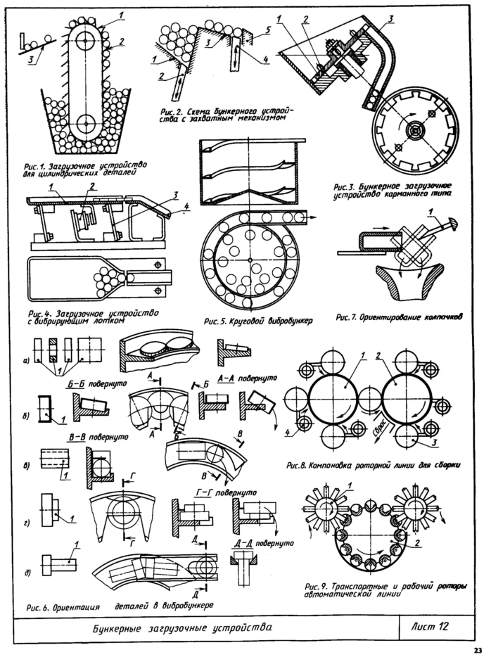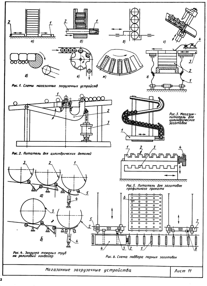 Загрузочное устройство для штучных элементов должно иметь накопитель для хранения запаса заготовок и механизм для отделения от всей массы одной заготовки с целью подачи ее в рабочую зону. В магазинных накопителях заготовки заранее ориентируются и укладываются в определенном порядке. На рис. 1, а, б приведены схемы вертикальных магазинных накопителей. Очередная заготовка 1 подается в рабочую зону толкателем-шибером 2, совершающим возвратно-поступательное движение. При этом толкатель удерживает все остальные заготовки, выполняя функцию не только питателя, но и отсекателя. Несколько иные схемы отсекателей показаны на рис. 1, в. г.. Здесь нижний штифт задерживает движение всех заготовок, а верхний, отсекая нижнюю заготовку, задерживает остальные. На рис. 1, д, е, ж даны примеры устройств отсекателей барабанного и дискового типа,