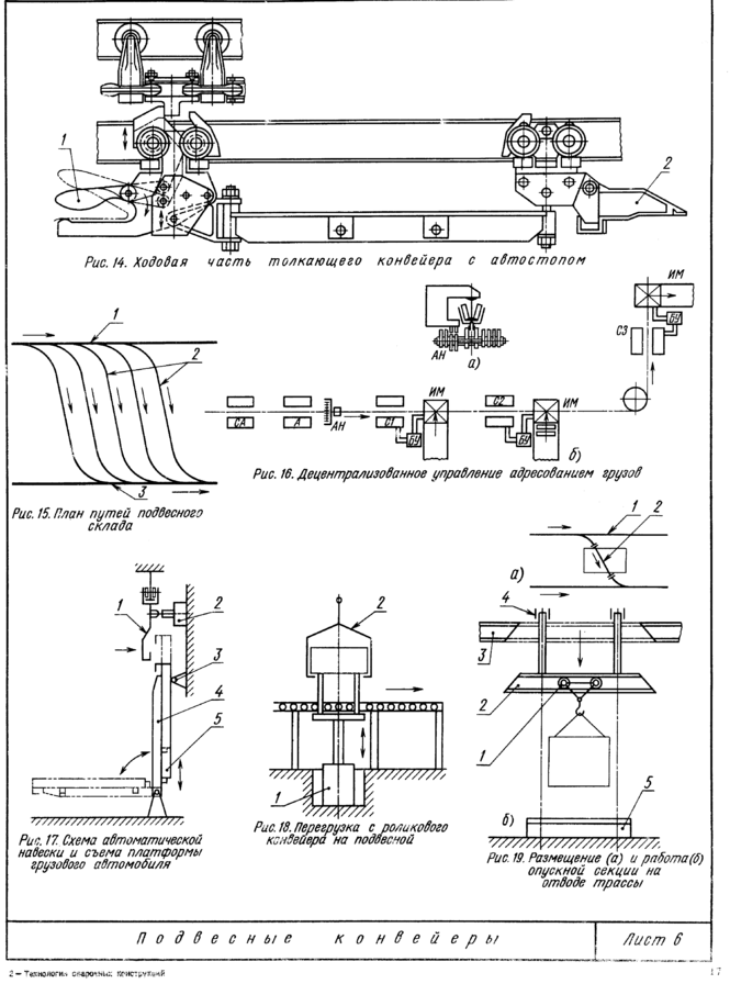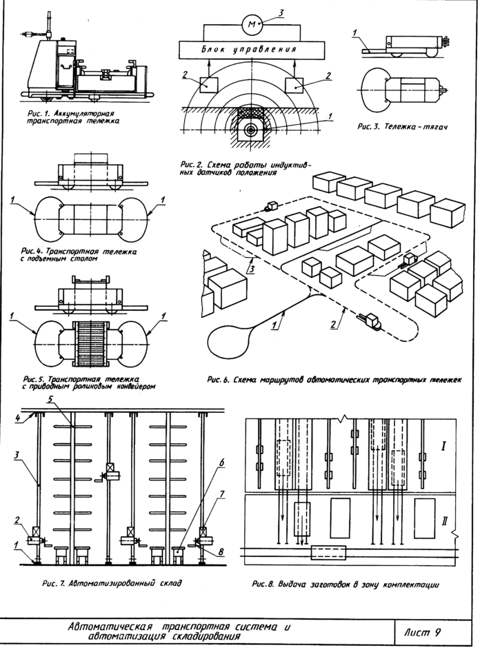 Иногда из числа имеющихся в накопителе заготовок необходимо выбрать определенную. Пример автоматической установки, выполняющей измерение листов по длине, хранение измеренных листов, выбор и выдачу на конвейер листа нужного размера, показан на рис. 6. Поступающие по роликовому конвейеру 1 листы 4 доходят до упора 2, останавливаются и автоматически измеряются по длине. Результаты измерений запоминаются ЭВМ, а листы рычагами 3 кантуются на ребро и передней передаточной тележкой 5 устанавливаются в карманы накопителя 6. Когда накопитель заполнен, очередной лист после измерения длины проходит по роликовому конвейеру на заготовительную линию, а ЭВМ выбирает из находящихся в накопителе листов ближайший к данному листу по длине лист и по команде выдает его на заднюю тележку 7. Тележка 7 подает лист к роликовому конвейеру 1 и рычагами 8 кантует лист, опуская его на роликовый конвейер, который транспортирует лист за предыдущим парным ему листом.