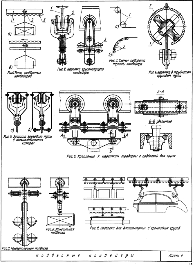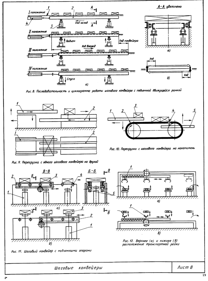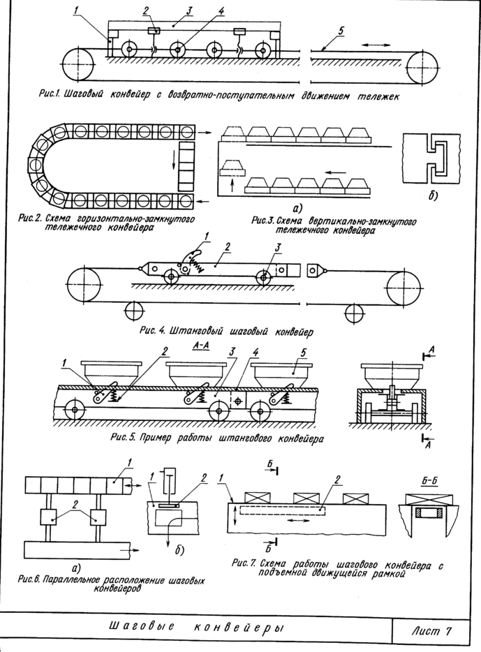 Питатель на рис. 5, предназначенный для загрузки на роликовый конвейер 4 длинномерных заготовок профильного проката, представляет собой рамку 1 с гнездами, в которые укладываются профили 2. Подвижная рамка 3 при подъеме принимает профили в свои гнезда, перемещает их на один шаг и опускает, причем крайний профиль оказывается на роликах конвейера 4, а рамка 3 в опущенном положении возвращается на исходную позицию.