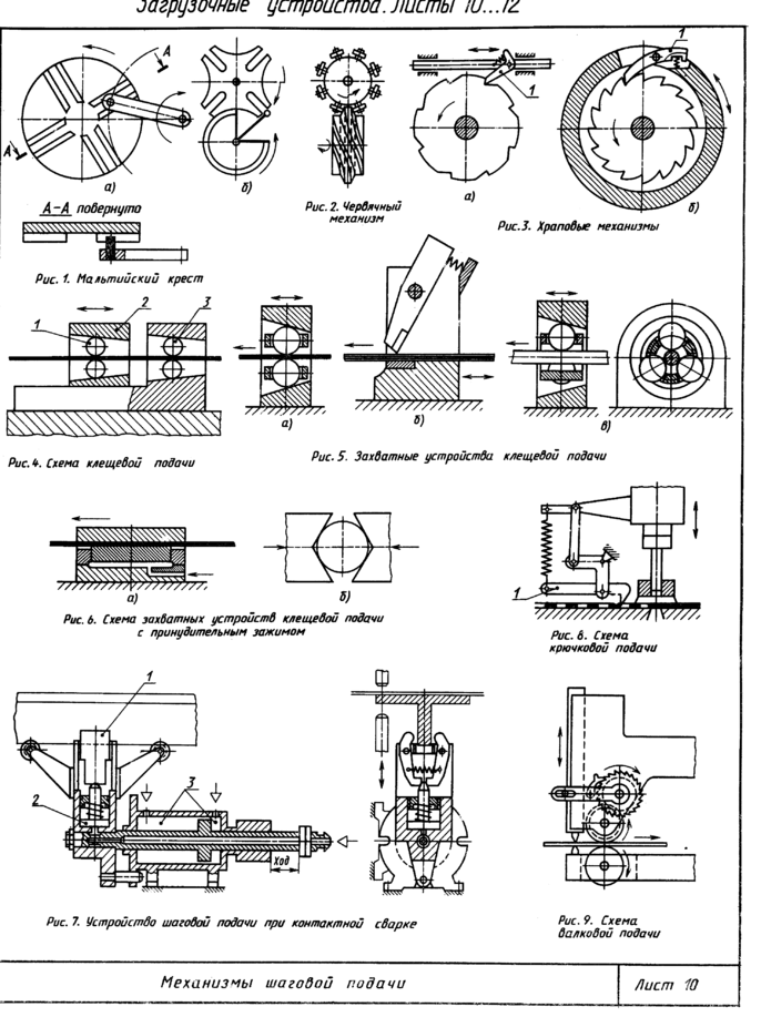 Загрузочные устройства используют для подачи деталей в технологическое оборудование или в технологические линии. Автоматическую шаговую подачу непрерывных заготовок в виде лент, полос, стержней осуществляют с помощью клещевых, валковых и крючковых устройств.