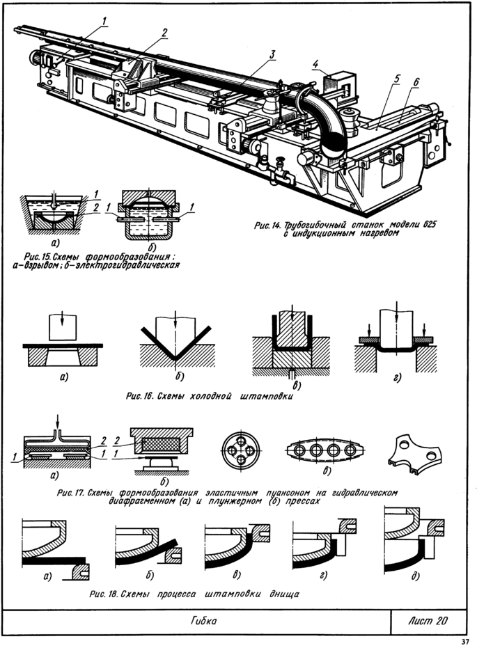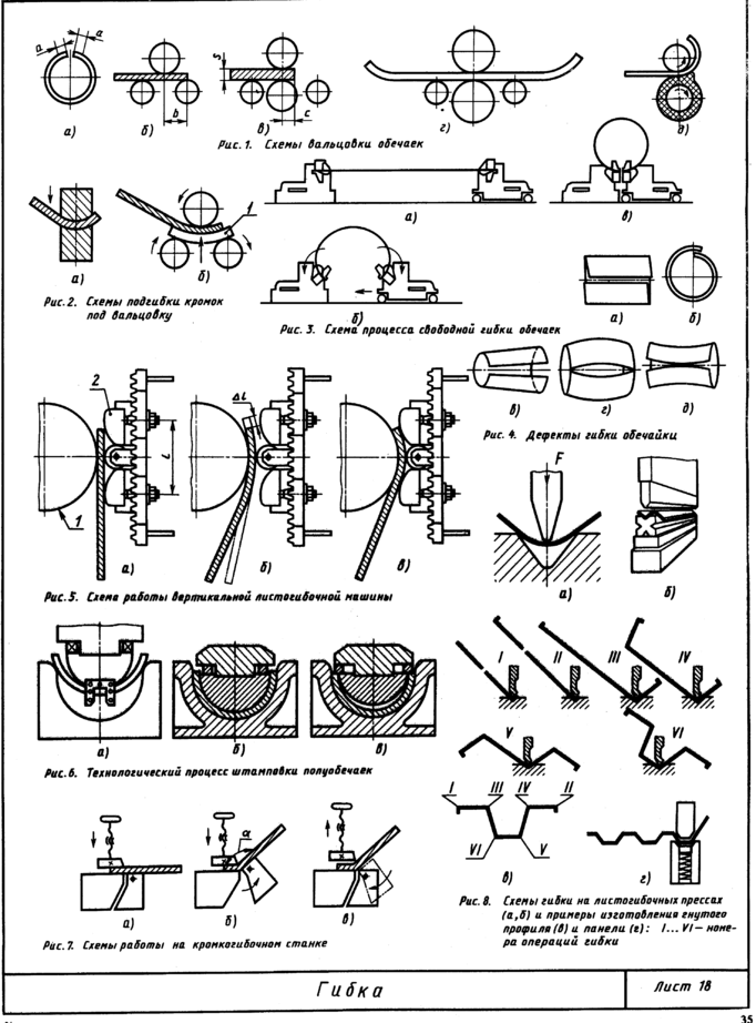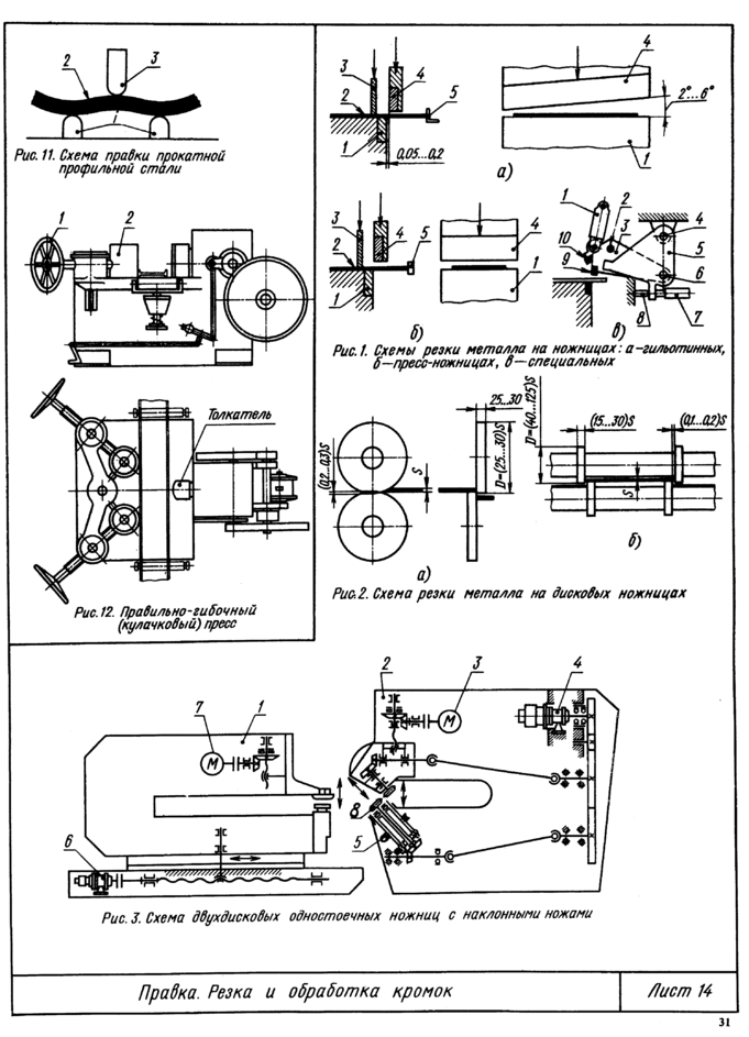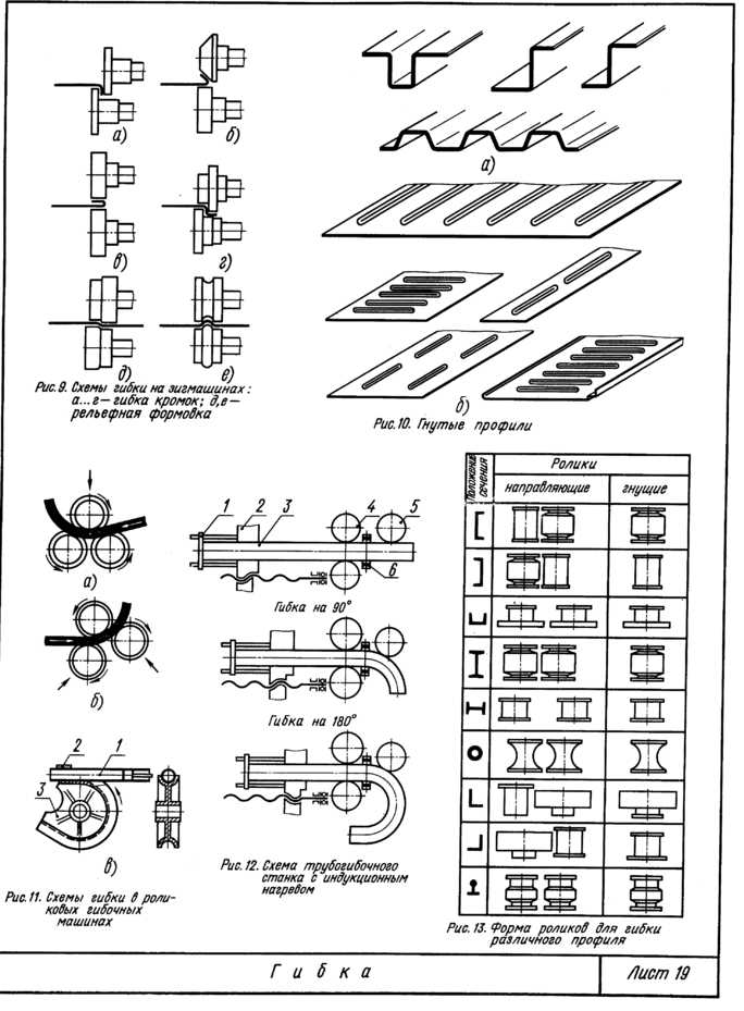 Примером комплексной механизации заготовительных операций в серийном производстве может служить поточная линия заготовок труб большого диаметра на Челябинском трубопрокатном заводе. Последовательность расположения ее агрегатов показана на рис. 25, д. С железнодорожной платформы 2 листоукладчиком 1 листы по одному подаются на приемный роликовый конвейер 3 и направляются в кромкострогальный станок 4 двусторонней строжки кромок и снятия фасок под сварку. Рабочее движение осуществляют клети с рабочими валками 1 (рис. 25, б), припуск снимается резцами 2. Формовка листа в трубную заготовку выполняется на кромкогибочном стане 5 (рис. 25, а, в) и прессах 7 и 8. Управление станом 5 и прессом 7 осуществляет один оператор. На выходе из стана подгибки кромок лист захватывается упором цепного конвейера б и попадает под пресс 7, одновременно выталкивая ранее сформованную заготовку. Предварительная формовка под прессом (рис. 25, г) производится при ходе пуансона 1 до упора в матрицу 4 с помощью кулис 3 с роликами 2. Потом заготовка поднимается вверх и выталкивается на промежуточный роликовый конвейер, откуда она цепным конвейером подается на окончательную формовку 9 (рис. 25, д), которая схематически показана на рис. 25, д.