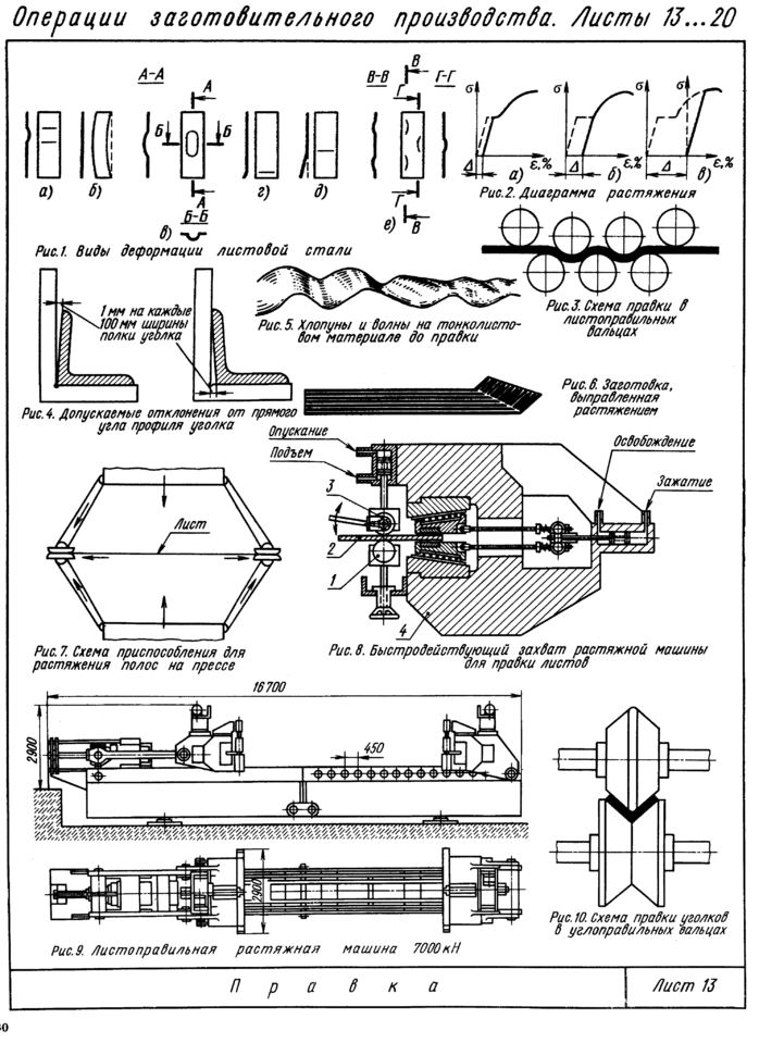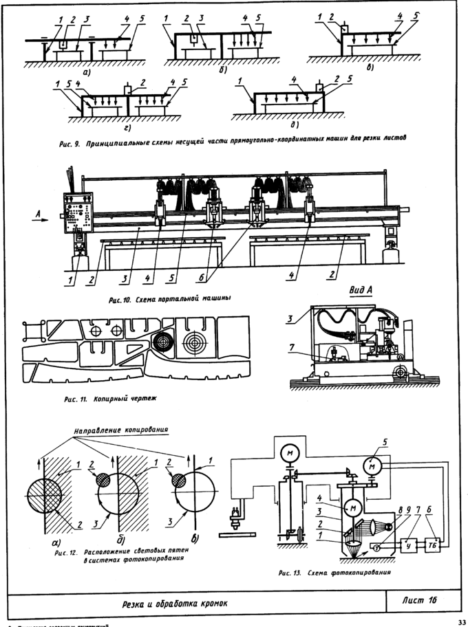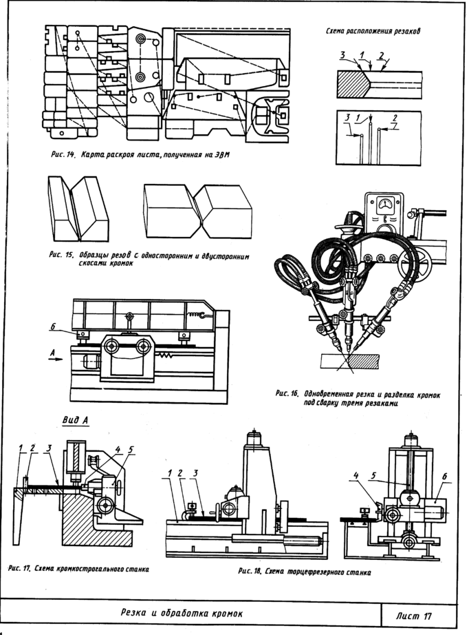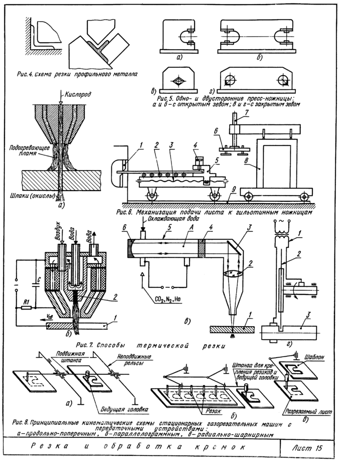 Участок термической резки предназначен для выполнения работ по маркировке и газовой вырезке всех деталей с криволинейными кромками из листовой стали толщиной 2 мм и более. Подача листов осуществляется по роликовым конвейерам на раскроечных платформах 7, у которых на основании 5 (рис. 24, а) установлены ребра 4, служащие опорой листа 3. На этих же платформах производится маркировка и термическая резка листов, а также уборка вырезанных деталей и отходов. Укладка листа на раскроенную платформу 7 (рис. 24, в) обеспечивается кантователем 2 в начале приемного роликового конвейера 6. Участок оборудован раскроечными платформами 7, двумя подающими роликовыми конвейерами 8 линии термической резки, роликовым конвейером 13 съема разрезанного листа и возвратным роликовым конвейером 14. Передача с роликового конвейера одного направления на другой, расположенный перпендикулярно, обеспечивается подъемом секции роликов. Подача листов и их транспортирование к механизмам линий термической резки, снятие деталей и их передача для дальнейшей обработки производятся при полуавтоматическом или ручном управлении.