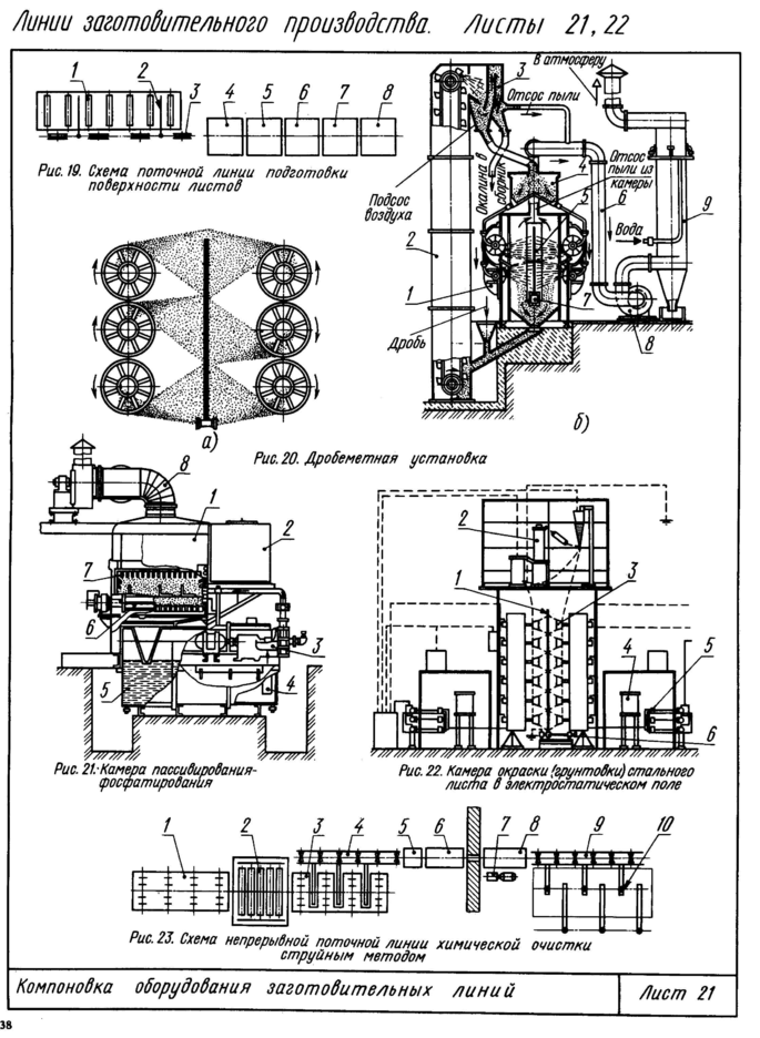 После дробеструйной обработки лист обдувают сжатым воздухом и подают в камеру 6 (рис. 19), которая содержит установку для пассивирования листа или окраски и грунтовки.