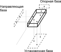 Для определения положения жесткой заготовки необходимо наличие шести опорных точек. Для их размещения требуются три поверхности (или заменяющие их три сочетания поверхностей). В зависимости от формы и размеров заготовки эти точки могут быть расположены на поверхности различно. На заготовках деталей, имеющих форму прямоугольного параллепипеда три опорные точки размещаются на поверхности, отличающейся наибольшими размерами, две – на поверхности, отличающейся наибольшим протяжением, одна – на поверхности, отличающейся наименьшими размерами (рис. 1).