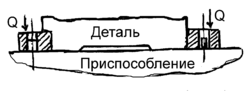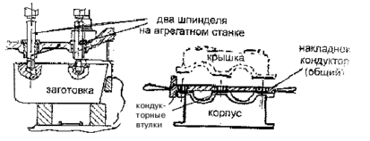 При обработке точных отверстий на агрегатно-расточных станках (многошпиндельных), обеспечение координат отверстий производится по кондуктору (на столе станка имеется 2-х местное приспособление):