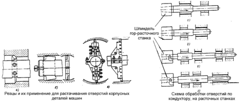 Для обработки отверстий применяют следующие виды инструментов: сверла, резцы, зенкеры, развертки, расточные головки, расточные пластины и др. Отделочная обработка отверстий осуществляется также пластическим деформированием при помощи шариковых и роликовых раскаток. С применением станков с ЧПУ простановку размеров в направлении осей координат д.б. увязывают с “нулевой” координатой станка.