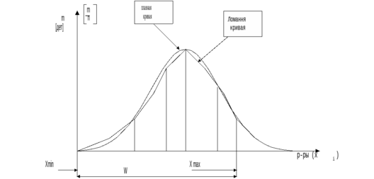 Обычно по оси ординат откладывают не "m" - абсолютную частоту появления данного р-ра в данном интервале , а m/n - относительную частоту, равную отношению числа деталей, попадающих в данный интервал к общему числу деталей в партии. При увеличении числа деталей в партии и единовременном уменьшении величины интервала (т.е. увеличении числа интервалов j>11) ломанная линия перейдет в плавную кривую. Обычно
