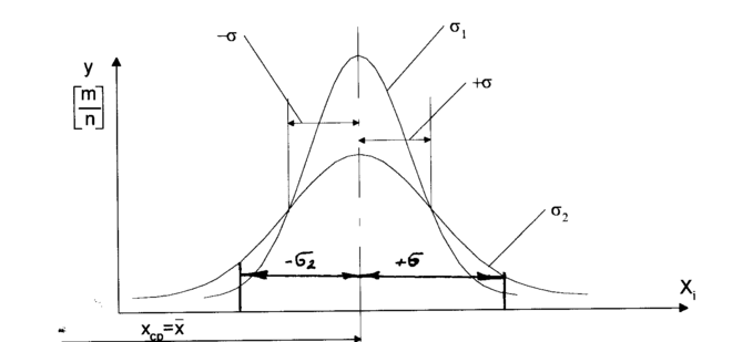 Симметричная форма кривой показывает, что отклонения размеров от среднего размера (Хср) в обе стороны равно вероятны. Величина характеризует точку перегиба кривой распределения. Форма кривой рассеяния сильно зависит от величины параметра : чем больше , тем более плавно идет кривая (см. Рис где 2>1), тем больше разброс размера в партии. Таким образом, величина сможет служить объективным критерием для суждения о плотности группирования размеров вокруг среднего значения , т.е. величина может быть мерой точности.