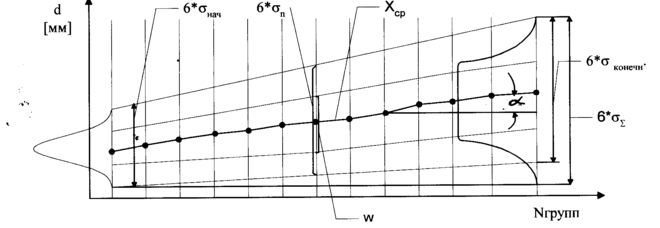 Из диаграмм видно, что поле рассеивания 6 размеров в пределах одной группы значительно меньше поля рассеивания для всей совокупности деталей 6.