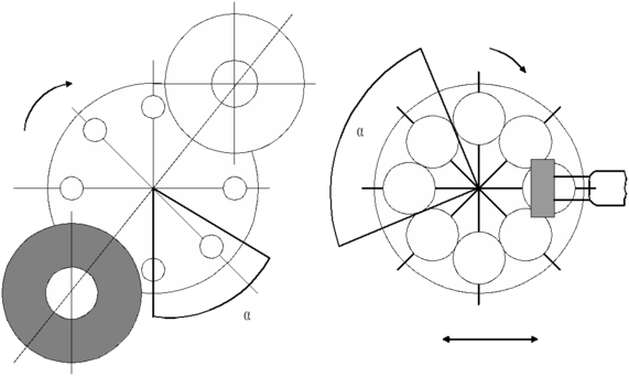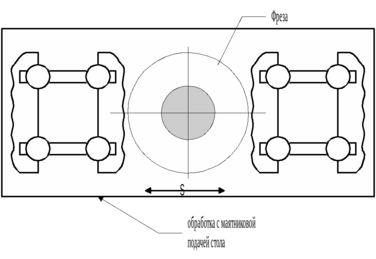Такие схемы осуществляются на станках с непрерывно вращающимися/движущимися столами или барабанами. В этом случае: