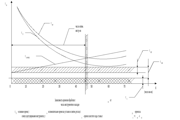 Здесь показан характер зависимости затрат времени от числа инструментов в наладке. Сростом числа инструментов интенсивность снижения времени обработки падает, а затем время начинает возрастать. Нецелесообразность чрезмерного увеличения числа инструментов определяется тем, что t0 оказывается меньше , чем tус инструмента.