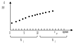 В случае построения по dср отчетливо видна периодичность изменения р-ров в результате непрерывно протекающего износа режущего инструмента и периодичность настроек станка.