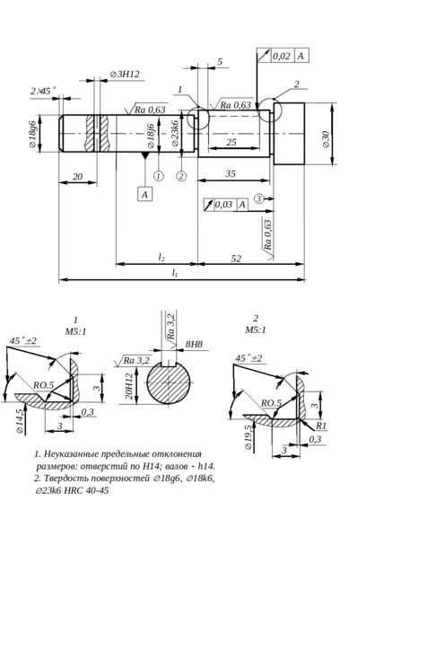 В. На рабочем чертеже указано техническое требование по твердости шеек 18g6, 18js6 и 23k6 – HRC 40-45; этого можно достичь термической обработкой – закалкой (материал детали – сталь 45).