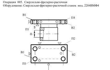 2. Если в конструкции детали могут быть выделены поверхности, которые могут быть использованы как постоянные базы, то желательно, чтобы они обрабатывались на начальном этапе технологического процесса при базировании по черновым базам. Например, при изготовлении кронштейна (рис. 3) в первой технологической операции обрабатывают плоскость П4 и два перпендикулярных ей отверстия В1 и В2. Черновыми базами при этом являются взаимно перпендикулярные плоскости П1, П2, П3. Далее совокупность поверхностей В1, В2, П4 используют, как постоянные базы для выполнения последующих операций процесса изготовления кронштейна. Следует помнить, что схема установки, изображенная на рис. 3, в случае, если отверстие D уже было получено в исходной заготовке, может вызвать неравномерность припуска при последующей обработке отверстия, а, следовательно, применима лишь при условии, что это не скажется на качестве готовой детали.