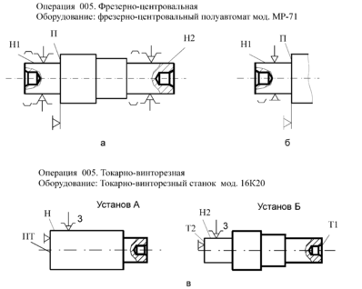 В единичном и мелкосерийном производстве центровые отверстия обрабатывают последовательно за два установа (рис. 2, в). Черновой базой являются: наружная цилиндрическая поверхность Н и торцевая плоскость ПТ. Обработанные в установе А поверхности Н2 и П2 используются в установе Б как промежуточные базы, обеспечивающие обработку противоположного торца Т1 и второго центрового отверстия.
