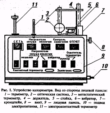 Калориметрическая установка состоит из калориметра, включающего калориметрический сосуд и калориметрическую оболочку, калориметрической бомбы, пресса для брикетирования, устройства для регистрации температуры (в зависимости от типа калориметра могут применяться метастатический термометр или цифровой вольтметр).