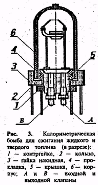 резиновой прокладки, служащей для уплотнения между корпусом и крышкой. Накидные гайки завинчиваются рукой, а окончательное уплотнение осуществляется за счет давления кислорода внутри бомбы, после чего контргайку подтягивают до упора. Через входной клапан А бомбу заполняют кислородом. Через выходной клапан В дренируются газообразные продукты сгорания после сжигания.