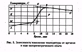 На миллиметровой бумаге начертить график изменения температуры от времени в ходе калориметрического опыта (1 мин = 1 см, 1 °С = 5 см). Как видно из графика (рис. 5), АС и BD — участки начального и конечного периодов, СВ — участок главного периода. Спроецировать точки В и С на ось температуры, найти середину отрезка тп и провести прямую kp, параллельную оси времени. Через точку L провести прямую, парал-