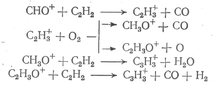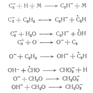 Первичные ионы пламени претерпевают сложный путь ионно-молекулярных превращений. В работе [84] предлагается схема реакций в начальной стадии горения ацетилена: