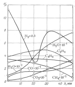 При анализе представленных на рис. 11.6 данных Ландольт отмечает следующее. Содержание окиси углерода до высоты 10 мм растет, затем остается постоянным, а с высоты 30 мм снова уве­личивается. Последнее происходит вследствие того, что углерод. образующийся в пламени, восстанавливает двуокись углерода. Со­держание водорода до высоты 20 мм быстро уменьшается, а затем (до высоты 30 мм) возрастает. Увеличение содержания водорода