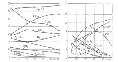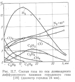 Состав устойчивых газообразных продуктов в коническом воз­душном ламинарном диффузионном пламени городского газа ис­следован в работе [18]: СН4 (78,9), Н2 (4,8), С2Н6 (3,8), С3Н8 (1,5), С2Н4 (0,4), СО (1,6), СO2 (2,0) N2 :[7,0 % (об.)]. Изменение состава газа по высоте пламени приведено на рис. II.7 Отбор га­зовых проб из пламени производился с помощью кварцевого ка-пилляра, который вводился по оси пламени снизу со стороны го-релки.Отобранный газ анализировался на содержание СО2, N2, CO,CH4, Н2, O2, С2Н6, C3Н8, С4Н103Н6, С4Н8, С2Н2. Содержание CO2 определялось поглощением щелочью, остальные компонен­ты — хроматографически. Содержание паров воды не анализиро­валось. Кислород внутри пламени не обнаружен, а присутствует ацетилен. Концентрация предельных углеводородов С3Н8, С2Н6 и CH4 по оси пламени быстро убывает. При этом сначала исчезает пропан, затем этан и метан. С уменьшением содержания предельных углеводородов в газе увеличивается содержание водорода и этилена. На некотором расстояния от основания пламени появ­ляется ацетилен. Содержание водорода, окиси углерода, этилена и ацетилена по мере приближения к вершине пламени сначала увеличивается, а затем уменьшается. Максимумы концентраций этилена и ацетилена .смещены относительно друг друга, причем максимум для ацетилена находится ближе к вершине пламени чем максимум для этилена.