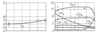 Отношение полного содержания кислорода как в связанном, так и в свободном состоянии внутри конуса пламени к содержа­нию азота в той же точке пламени превышает отношение [O2]/[N2] в воздухе; Это свидетельствует о том, что средний коэффициент диффузии Н2О, СО и СO2 больше, чем коэффициент диффузии азота.