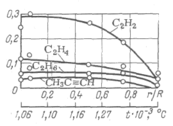 На рис.II.8 концентрации основных компонентов, находящих­ся внутри конуса диффузионного пламени метана, представлены в зависимости от отношения расстояния от газоотборника до оси