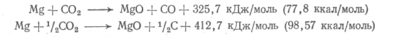Спектр пламени при горении магния в смеси двуокиси угле­рода и кислорода исследован Меллором и Глассменом [76] и ока­зался таким же, как и при горении в смеси кислорода и аргона. Не обнаружено никаких признаков существования полос СО2, СО или С2.Можно предполагать, что продуктом сгорания магния в смеси двуокиси углерода и кислорода является также MgO с при­месью частичек углерода. Термодинамические расчеты показыба-ют, что магний предпочтительнее вступает в реакцию, восстанов­ления СО2 до С, а не до СО: