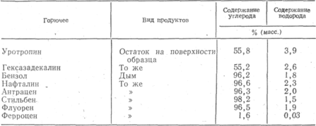 Химический состав конденсированных продуктов. Хлопьевид­ный остаток, образующийся на поверхности горения образцов уро­тропина и гексазадекалина, а также дым, образующийся при горе­нии бензола, нафталина, антрацена, стильбена; флуорена и фер­роцена, были собраны и подвергнуты микроанализу на содержание углерода и водорода методом пиролитического сожжения в токе кислорода. Помимо углерода и водорода значительную часть хлопьевидного остатка, образующегося при горении уротропина и гексазадекалина, очевидно, составляет азот (табл. П.6).