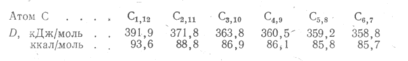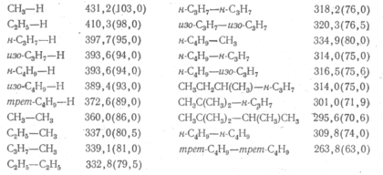 Энергия разрыва связей. На начальных стадиях термического разложения обычно рвутся химические связи с наименьшей энер­гией разрыва. Ниже приведены значения энергий разрыва связей D в молекулах некоторых углеводородов кДж/моль (ккал/моль) [8, с. 14; 9; 10]