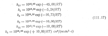Тепловые эффекты основных реакций (1), (2), (3), (4), (10) и (11) соответственно составляют 61,5; —67,0; 8,4; 218,0; —75,0 и 67 кДж/моль (14,5; —16,0; 2,0; 52,0; —18,0 и 16,0 ккал/моль). Для расчета характеристик горения используют следующие выражения для констант скорости основных реакций [в см3/(моль*с)] [149]: