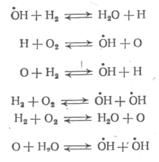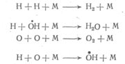 Все другие бимолекулярные процессы представляют собой просто обменные процессы, не приводящие к образованию новых продуктов. Предполагается, что эти шесть обратимых реакций объясняют появление в большом количестве частиц Н, О и ОН. При отсутствии твердых стенок, облегчающих рекомбинацию, единственным механизмом исчезновения радикалов считается реакция, с третьим телом [3, с. 306],