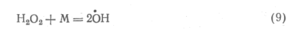 Образование активных центров в этом случае, также как и в случае реакции водорода с кислородом, может происходить при диссоциации молекул перекиси водорода в газовой фазе