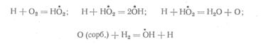 Окисление СО при высоких температурах и давлениях рассмотрено Зельдовичем и Семеновым в 1940 г. Они отбрасывают прежде всего все превращения, связанные с ударами о стенку, как не имеющие существенного значения при высоких давлениях. Малая устойчивость О3 при высоких температурах (в состоянии равновесия при 2000 °С концентрация О3 в 104 раз меньше концентрации атомов О) позволяет не принимать во внимание взаимодействий, ведущих к его образованию и разрушению. Наконец, они не учитывают присутствия НО2•. Вместе с тем, авторы полагают, что при высоких температурах реакции (3) и (1) достигают равновесия, и поэтому вводят в рассмотрение обратные им взаимодействия: