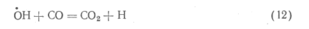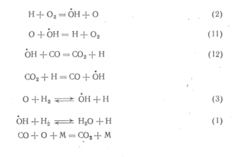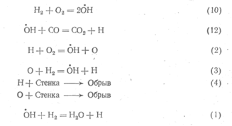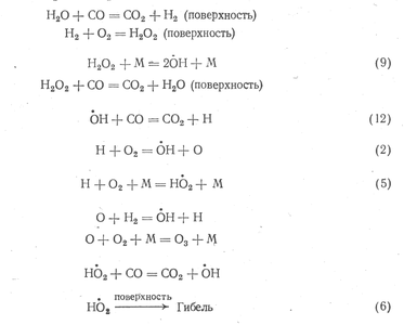 а для реакций (2) и (12) учитывают измеримые значения их скоростей в обратном направлении. Это равнозначно обрыву цепей и торможению процесса, что обусловливает относительно медленное окисление СО при давлениях, превосходящих верхний предел. Таким образом, Зельдович и Семенов принимают для горения СО при высоких температурах и давлениях следующие элементарные реакции: