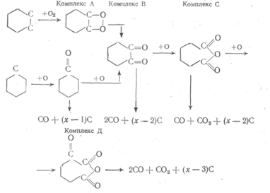 Состав первичных окислов углерода зависит от условий горения и тесно связан со структурой промежуточного комплекса на поверхности углерода (кольца). Комплекс может реагировать с атомным кислородом и усложняться или распадаться с образованием окислов углерода: