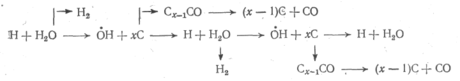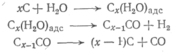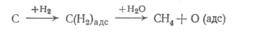 Мейер исследовал реакцию C+H2O и также установил, что в результате образуются только СО и Н2 в эквимолекулярных количествах. Энергия активации составляла ту же самую величину, что и для реакции СO2 + С. По данным ряда работ [123], механизм взаимодействия угля с водяными парами сходен с принятым для реакции С+ СO2. Полагают, что молекулы воды распадаются на поверхности углерода, образуя кето-комплексы и адсорбированные атомы водорода: