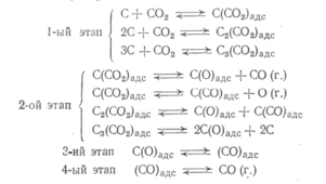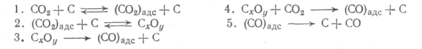 Первые две стадии показывают, как образуется поверхностный комплекс СхОу, третья стадия отражает термический распад поверхностного комплекса, четвертая — разрушение поверхностного комплекса за счет удара молекулы CO2 и пятая—процесс десорбции окиси углерода.