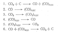 Франк-Каменецким были предложены схемы взаимодействия' СО2, с твердым углеродом. Одна из них выглядит следующим образом: