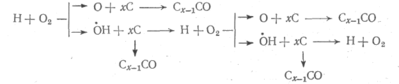 При реагировании гидроксила с углеродом возникает цепная реакция с неразветвленными цепями, обеспечивающая непрерывность процесса горения: