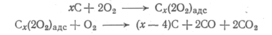 Мейер в 1932 г. сделал предположение, что до 1500 К адсорбируются две молекулы кислорода, которые при ударе третьей молекулы дают равное количество СО2 и СО. Схематически это мож-но изобразить следующим образом: