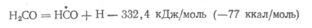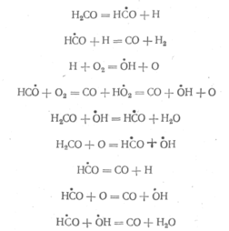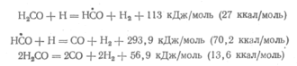 имеющая энергию активации около 8 кДж/моль (2 ккал/моль). По мере накопления в системе формальдегида радикалы зарождаются преимущественно по этой реакции. Наиболее вероятно, что образующийся в результате этого процесса радикал НСО разлагается на атом Н и СО по уравнению