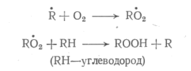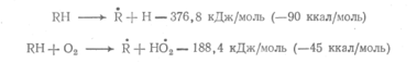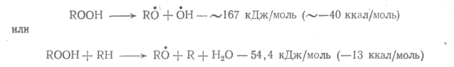 Таким образом развивается основная цепь. В качестве первичного продукта образуется гидроперекись ROOH, в которой связь О—О сравнительно слабая [~167 кДж/моль (~40 ккал/моль)]. Поэтому гидроперекись способна медленно разлагаться на свободные радикалы: