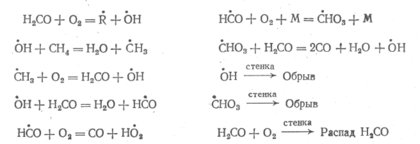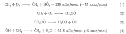 На основании экспериментальных данных Семенов с сотр. [132] предложил схему механизма низкотемпературного окисления метана, согласно которой развитие цепей происходит через монорадикалы, причем ведущими активными центрами являются метальный и гидроксильный радикалы, а вырожденное разветвление осуществляется с участием формальдегида. Первичное зарождение свободных радикалов из исходных веществ при отсутствии искусственного инициирования может происходить по реакции [92, 132]