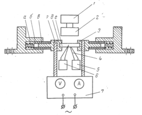 1 — кинокамера РФК-5; 2 — микроскоп МБС-2; 3 — нагревательная ячейка (а — пружина; б — держатель; в — асбестовая втулка; г — медный токопровод; д — медный держатель; в — графитовая пластинка); 4 — термопары; 5 — потенциометр; 6 — быстродействующий самописец Н373-1; 7 — универсальный блок питания.