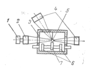 1 — кинокамера CKC-IM; 2 — микроскоп МБС-2; 3 — камера с окислительной средой; 4 — осветительные лампы; 5 — исследуемая частица на подвеске; 6 — элементы токоподвода; 7 — нагревательный элемент.