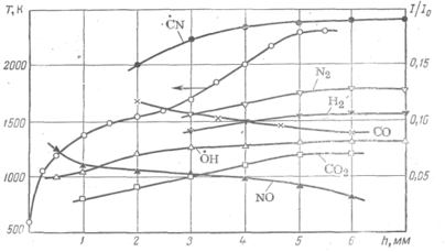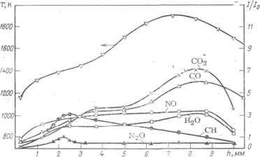 Существенным при рассмотрении вопроса об излучении пламени является определение начала высвечивания спектральных линий продуктов в пламени по отношению к поверхности образца. На рис. V.7 приведено распределение основных компонентов по высоте пламени нитроклетчатки (I/Iо — отношение интенсивности исследуемой спектральной линии к интенсивности линии ртутного источника с =435,8 нм). На расстоянии 0,5—0,7 мм от поверхности горения высвечивает радикал •ОН. В темной зоне на высоте 1,5—2 мм интенсивно высвечивает радикал •CN. Это связано, по-видимому с повышенным .содержанием связанного азота в продуктах разложения нитроклетчатки. Появление радикала С2 наблюдается вблизи зоны максимальной температуры: Кроме того, по высоте пламени наблюдается уменьшение СО и NO и увеличение СО2, Н2, N2.