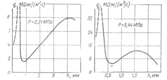 Рассмотрим изменение кривой q[T(x)]—скорость тепловыделения химических реакций по высоте пламени пороха Н — при давлении 2,25 и 5,55 МПа (рис. V.6). Как видно, для фиксированного давления функция q[T(x)] достигает своего первого максимума на определенном расстоянии от поверхности пороха, затем уменьшается и вновь возрастает, достигая второго максимума в зоне максимальной температуры пламени. Первый максимум тепловыделения при Р=5,55 МПа расположен на расстояний ~0,15 мм от поверхности топлива. Определить значения максимальной скорости тепловыделения в зоне первого максимума затруднительно из-за погрешности при графическом дифференцировании небольшого участка экстраполяционной температурной кривой. После первого максимума скорость тепловыделения постепенно уменьшается, затем скорость тепловыделения возрастает и до-